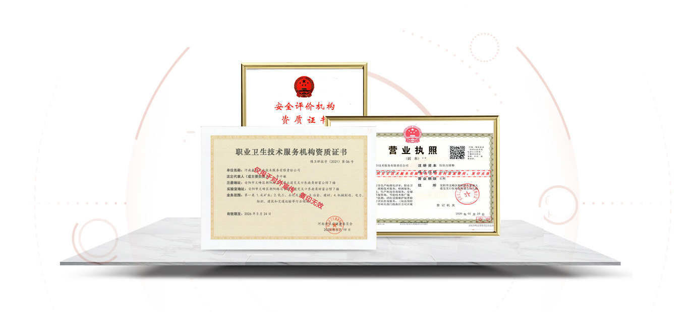 職業(yè)衛(wèi)生檢測、評價資質(zhì)證書證書編號:(豫)衛(wèi)職技字(2021)第6號業(yè)務(wù)范圍:采礦業(yè)、化工、石化及醫(yī)藥等